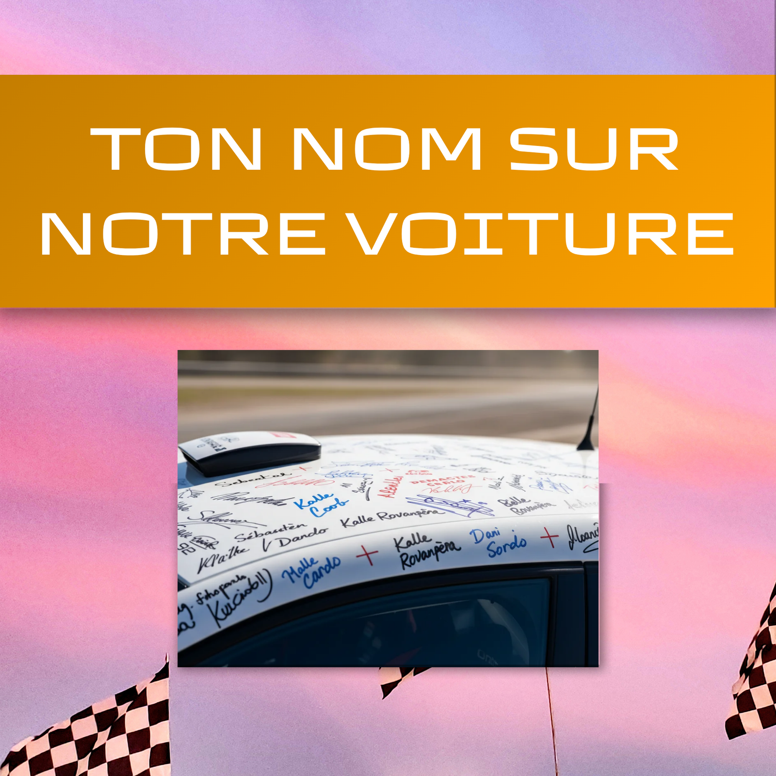 Fais partie de l’aventure : nous composerons un visuel unique regroupant tous les noms “supporters” et l’apposerons sur la voiture (toit ou panneau dédié).